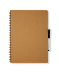 Cover is made of 80% post consumer recycled materials, metal spiral binding is made of 90% post consumer recycled materials, pen barrel is made of 100% post consumer recycled paper