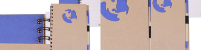 Recycled hard cover wire-bound notebook with die cut global (earth-shape) cover design.