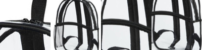 PVC; Clear PVC body; Contrasting binding; Front zipper pocket; Side mesh pocket; Padded adjustable straps; 12"W x 15 1/4" H x 4"D ; Requires California Prop 65 Warning Label;